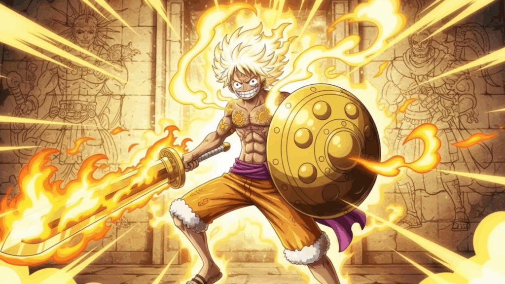 On sait que la légende de Nika est profondément enracinée dans la culture d’Elbaf, transmise par les pirates et les esclaves. Et ce n’est pas un hasard si Nika est toujours dépeint comme un guerrier armé d’une lance ou d’une épée, avec un bouclier, des armes typiques des Vikings. Luffy, avec son Gear 5, a déjà montré sa capacité à créer des objets à partir de son corps élastique, comme ses lunettes ou son casque à Egghead. Il pourrait bien se fabriquer les armes de Nika lui-même !